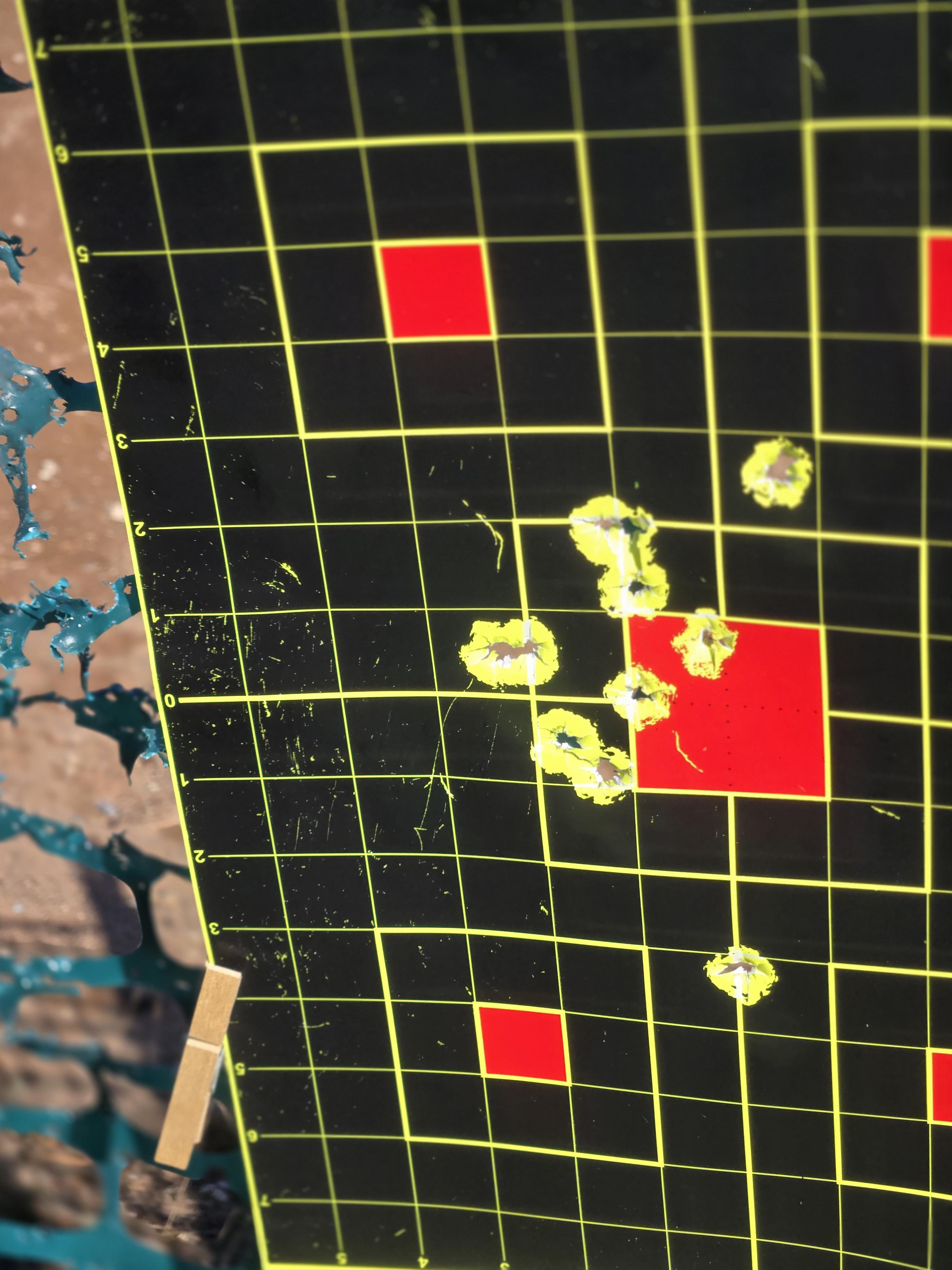 Followup: I didn't pick the best range day, 38F with a 20 mph wind, but that is life. I put 36 rounds through the CSX including 5 hollow points that will be it's normal load. It ate everything, and while not the best day to try, accuracy from 15 yards was decent. Below is my last magazine, fairly rapid fire. An interesting thing about this pistol, while it reminds me of a 1911, it has no grip safety, but has a Glock style trigger, With the center bar takeup necessary for the hammer to fall-which works very well I might add. Kind of like what you get if a 1911 and a Glock decided to have a baby. The trigger takes more pressure to release than a 1911, but is very crisp. All in all I really like it. It's a keeper.